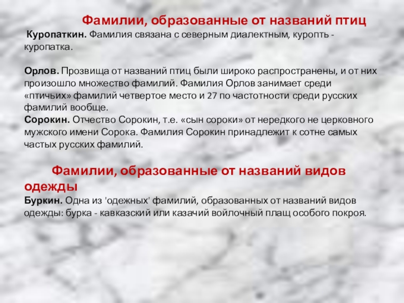 Цель работы: расширить представления о происхождении и значении русских фамилий.