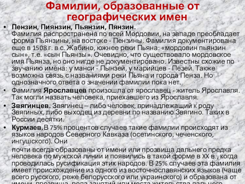 6)Хотя русские фамилии, казалось бы, просто распознать на слух, однако точно определить их круг нелегко. Некоторые вроде бы типично русские фамилии присущи и другим славянским нациям, а также некоторым неславянским национальностям, населяющим Россию.