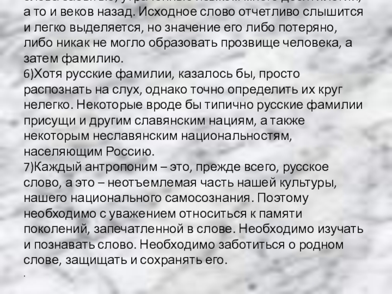 7)Каждый антропоним – это, прежде всего, русское слово, а это – неотъемлемая часть нашей культуры, нашего национального самосознания. Поэтому необходимо с уважением относиться к памяти поколений, запечатленной в слове. Необходимо изучать и познавать слово. Необходимо заботиться о родном слове, защищать и сохранять его.