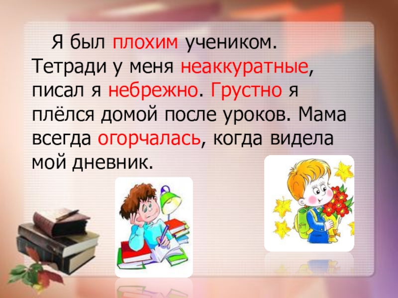 Грустно я плёлся домой после уроков. Мама всегда огорчалась, когда видела мой дневник.