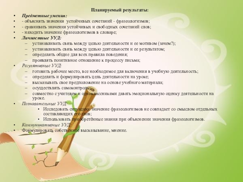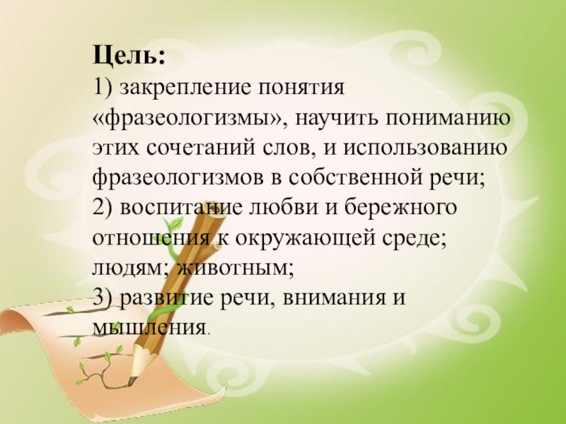 1) закрепление понятия «фразеологизмы», научить пониманию этих сочетаний слов, и использованию фразеологизмов в собственной речи;