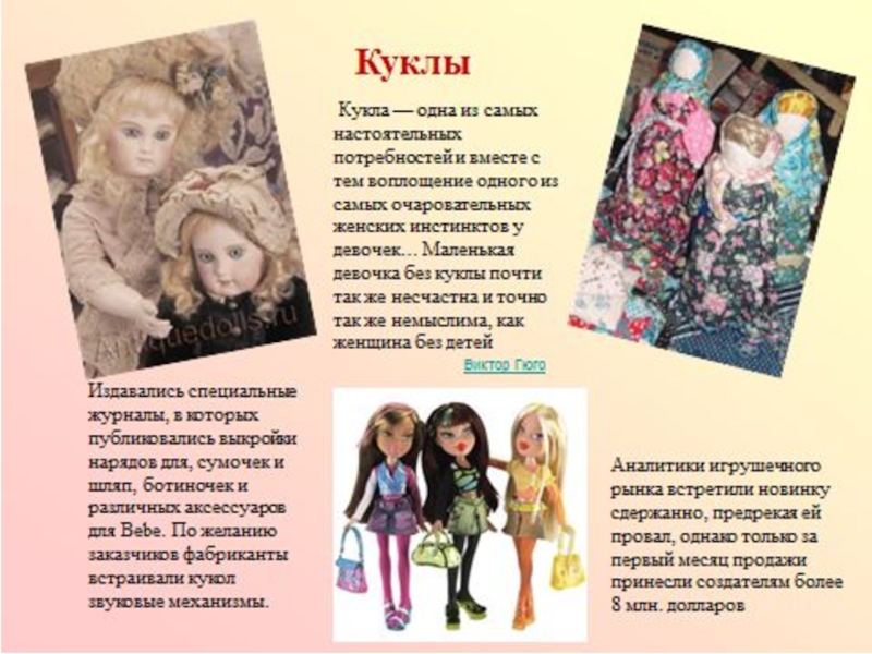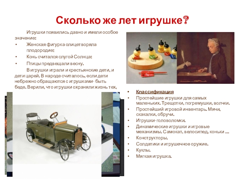 В игрушки играли и крестьянские дети, и дети царей. В народе считалось, если дети небрежно обращаются с игрушками- быть беде. Верили, что игрушки охраняли жизнь тех, кто играет в них.