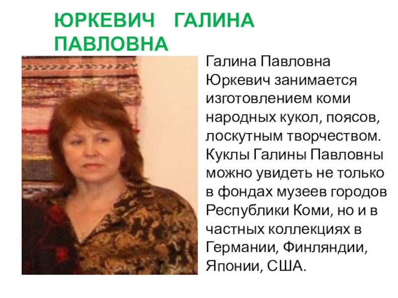 поясов, лоскутным творчеством. Куклы Галины Павловны можно увидеть не только в фондах музеев городов Республики Коми, но и в частных коллекциях в Германии, Финляндии, Японии, США.
