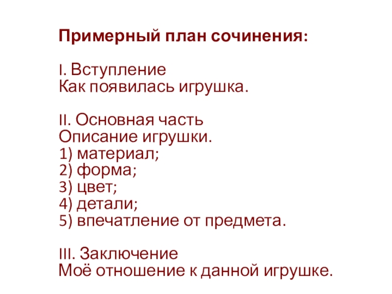 Особое внимание обратите на начало и окончание текста, имея в виду, что они зависят от цели высказывания и стиля текста. В ваших описаниях должно быть искреннее чувство. Вы можете разговаривать со своей игрушкой, вспоминать, как и где она была приобретена, описать её историю.