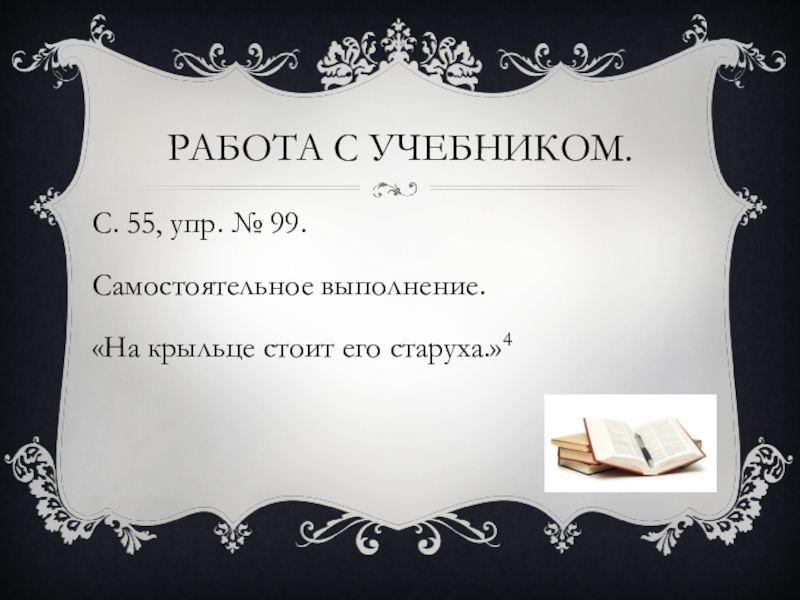 Работа с учебником.С. 55, упр. № 99. Самостоятельное выполнение.«На крыльце стоит его старуха.»4