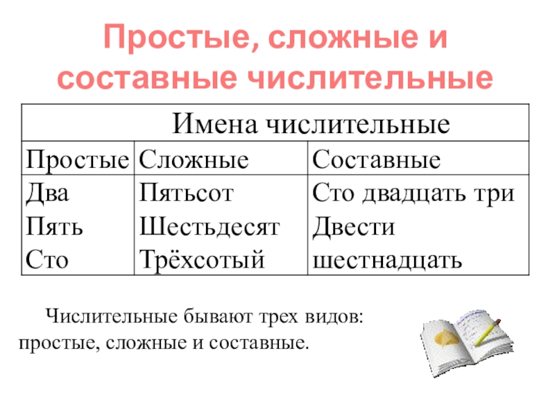 строения числительные бывают трех видов: простые, сложные и составные.