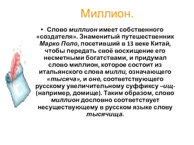 Слово миллион имеет собственного «создателя». Знаменитый путешественник Марко Поло, посетивший в
