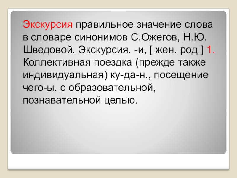 Экскурсия правильное значение слова в словаре синонимов С.Ожегов, Н.Ю.Шведовой. Экскурсия. -и, [ жен. род ] 1. Коллективная