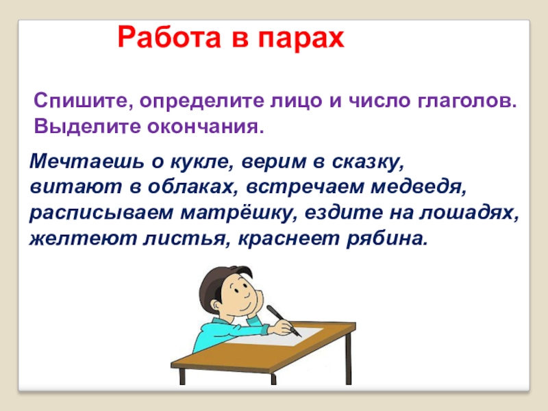 Работа в парахСпишите, определите лицо и число глаголов.Выделите окончания.Мечтаешь о кукле, верим в сказку,витают в облаках, встречаем