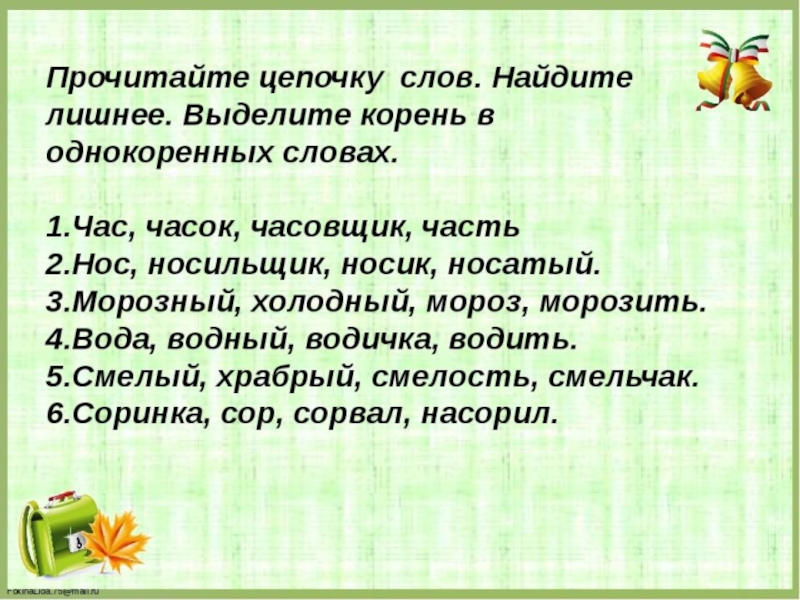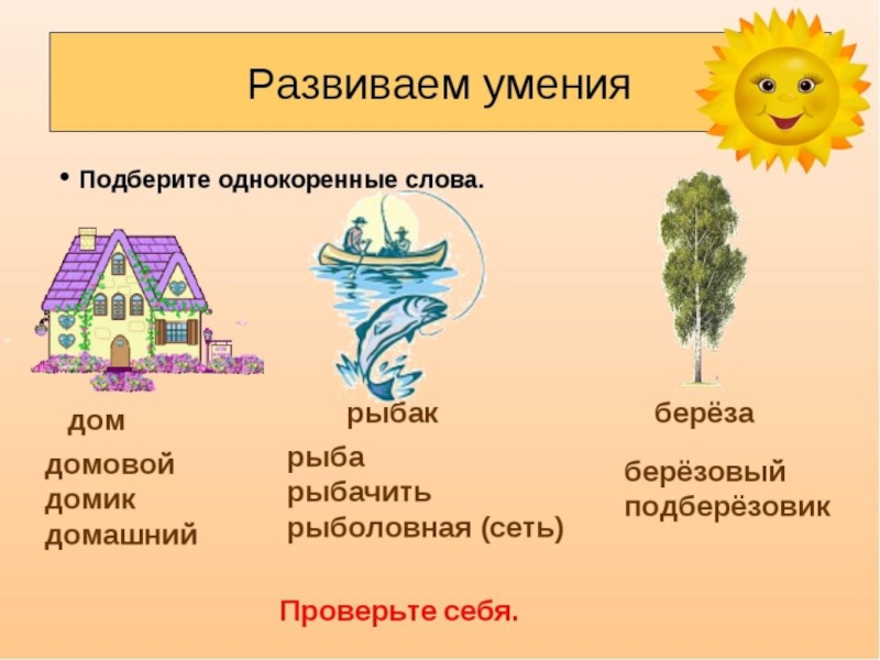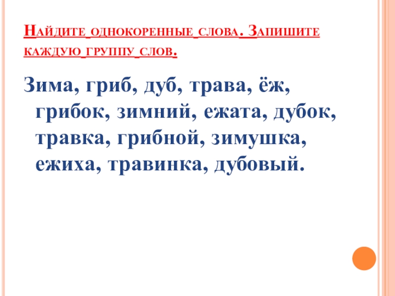 Слайд 9Найдите однокоренные слова. Запишите каждую группу слов.