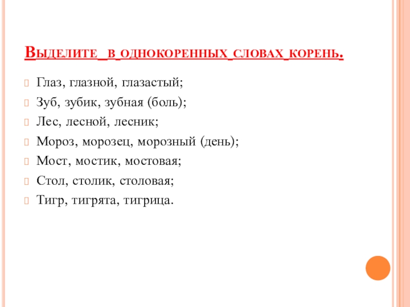 Выделите в однокоренных словах корень.Глаз, глазной, глазастый;Зуб, зубик, зубная (боль);Лес, лесной, лесник;Мороз, морозец, морозный (день);Мост, мостик, мостовая;Стол, столик, столовая;Тигр, тигрята, тигрица.