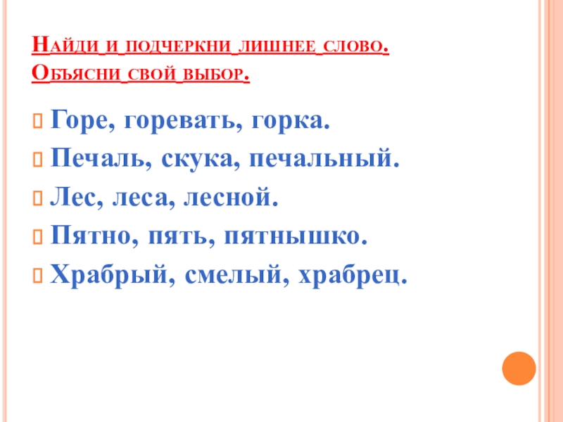 Найди и подчеркни лишнее слово. Объясни свой выбор.Горе, горевать, горка.Печаль, скука, печальный.Лес, леса, лесной.Пятно, пять, пятнышко.Храбрый, смелый,