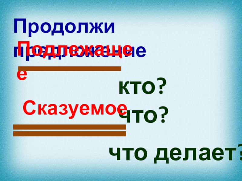 Продолжи предложениеПодлежащее кто?	 что?Сказуемое что делает?