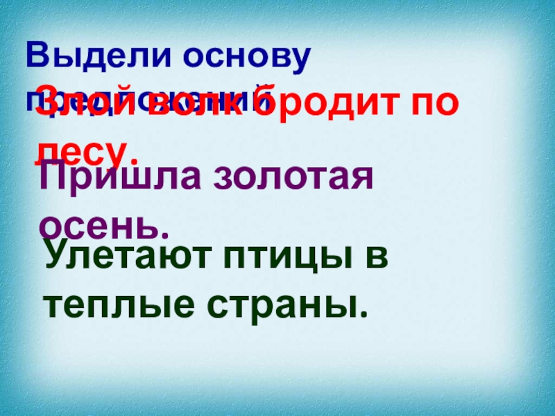 Выдели основу предложенийЗлой волк бродит по лесу.Пришла золотая осень.Улетают птицы в теплые страны.