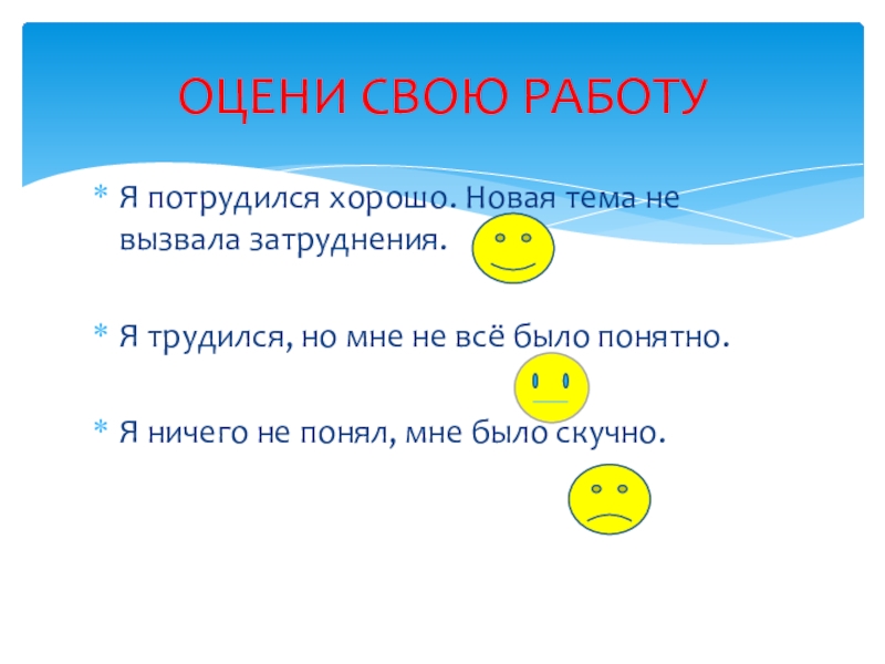 Я потрудился хорошо. Новая тема не вызвала затруднения.Я трудился, но мне не всё было понятно.Я ничего не
