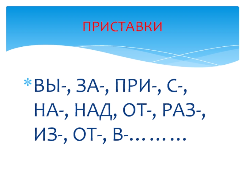 Слайд 5ВЫ-, ЗА-, ПРИ-, С-, НА-, НАД, ОТ-, РАЗ-, ИЗ-, ОТ-, В-………