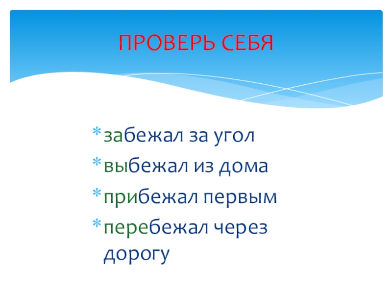 забежал за уголвыбежал из домаприбежал первымперебежал через дорогуПРОВЕРЬ СЕБЯ