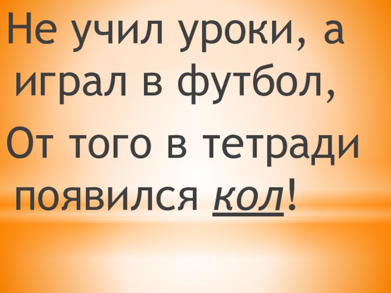 Не учил уроки, а играл в футбол,От того в тетради появился кол!