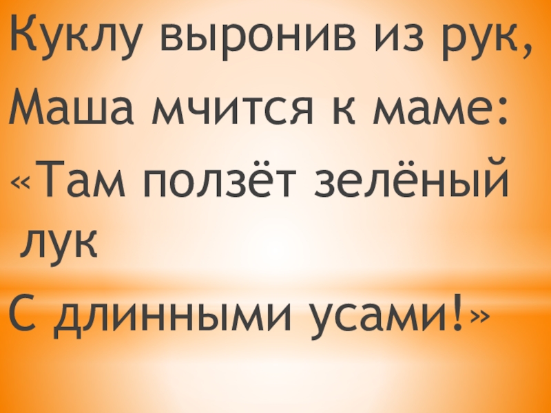 Куклу выронив из рук,Маша мчится к маме:«Там ползёт зелёный лукС длинными усами!»