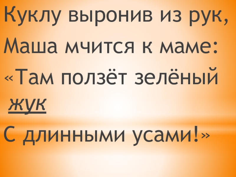 Куклу выронив из рук,Маша мчится к маме:«Там ползёт зелёный жукС длинными усами!»