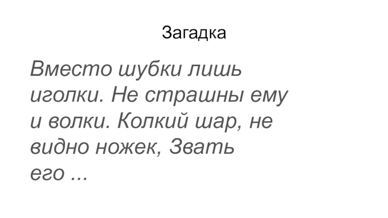 ЗагадкаВместо шубки лишь иголки. Не страшны ему и волки. Колкий шар, не видно ножек, Звать его ...