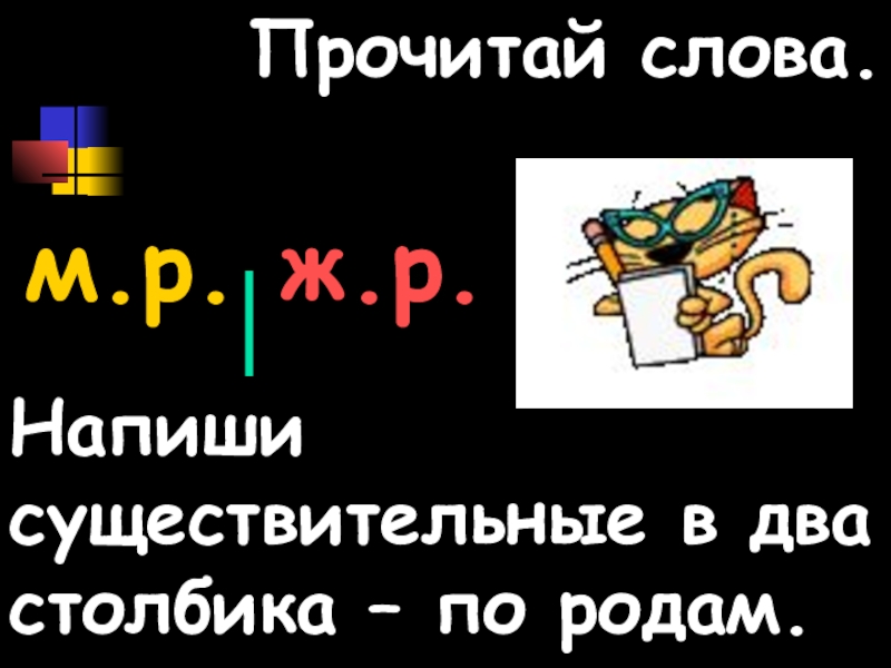 Прочитай слова.   Напиши существительные в два столбика – по родам.м.р. ж.р.