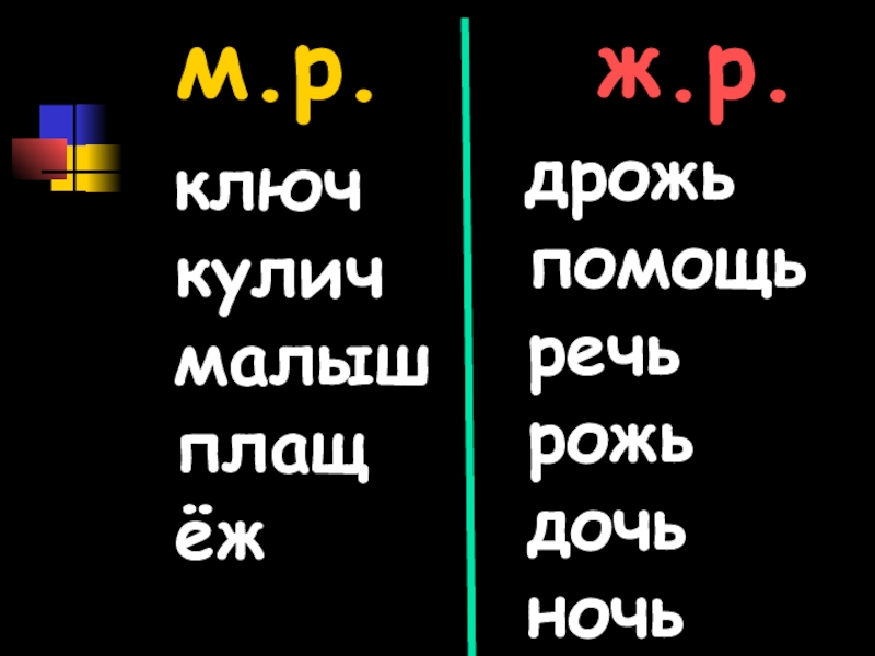 м.р.   ж.р. ключ кулич малыш плащ ёж дрожь помощь речь рожь дочь ночь