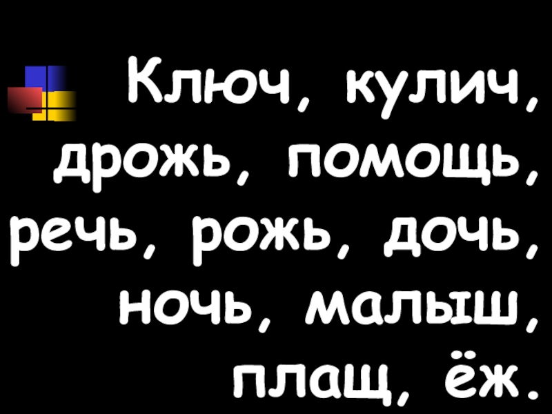 Слайд 12Ключ, кулич, дрожь, помощь, речь, рожь, дочь, ночь, малыш, плащ, ёж.