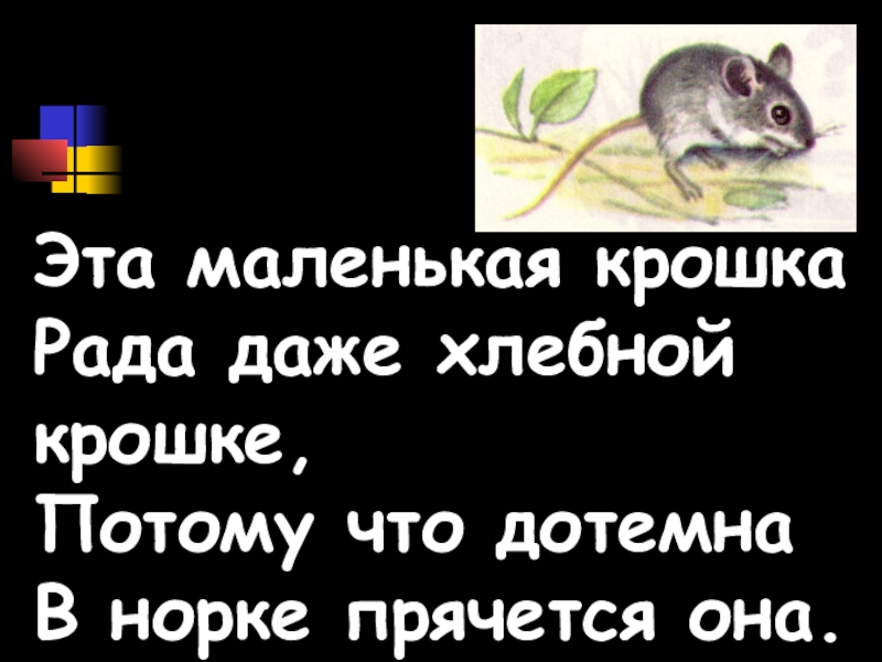 Эта маленькая крошкаРада даже хлебной крошке,Потому что дотемнаВ норке прячется она.