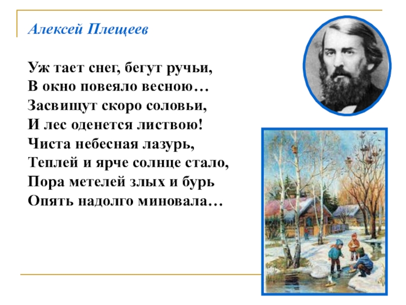Алексей ПлещеевУж тает снег, бегут ручьи, В окно повеяло весною… Засвищут скоро соловьи, И лес оденется листвою!