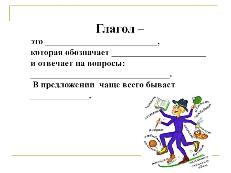 Глагол –это _________________________,которая обозначает _____________________и отвечает на вопросы: _______________________________. В предложении чаще всего бывает _____________.
