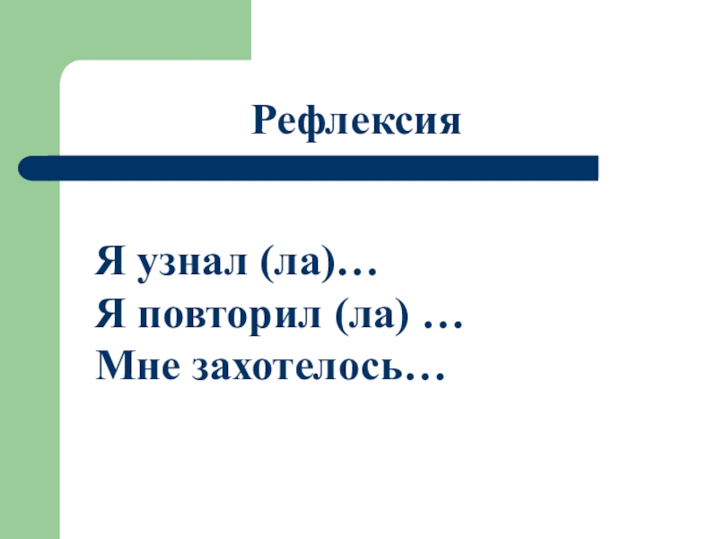 РефлексияЯ узнал (ла)…Я повторил (ла) …Мне захотелось…
