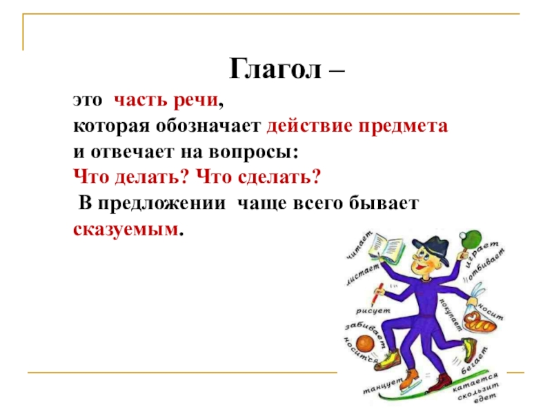 Глагол –это часть речи,которая обозначает действие предметаи отвечает на вопросы: Что делать? Что сделать? В предложении чаще