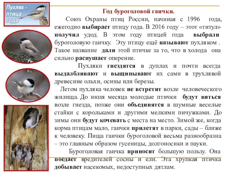 года, ежегодно выбирает птицу года. В 2016 году – этот «титул» получил удод. В этом году птицей года выбрали буроголовую гаичку. Эту птицу ещё называют пухляком . Такое название дали этой птичке за то, что в холода она сильно распушает оперение.