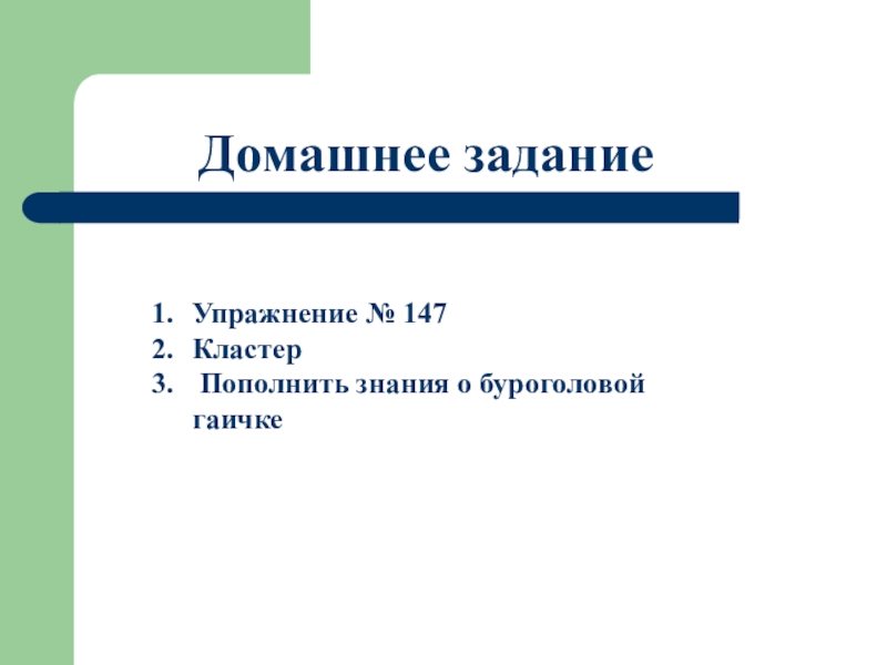 Домашнее заданиеУпражнение № 147Кластер Пополнить знания о буроголовой гаичке