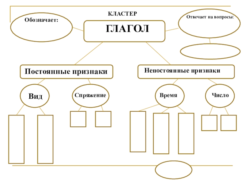 ГЛАГОЛОбозначает:Отвечает на вопросы:Постоянные признакиНепостоянные признакиВидСпряжениеВремяЧислоКЛАСТЕР