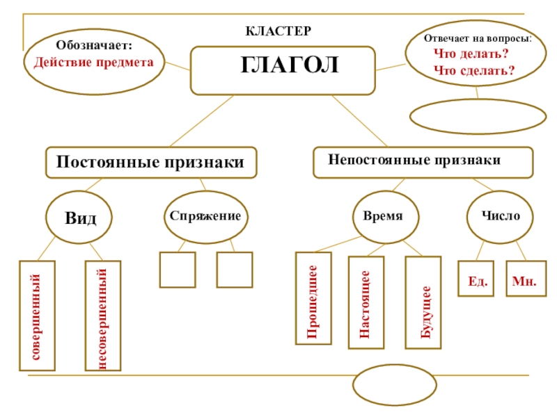 ГЛАГОЛОбозначает:Отвечает на вопросы:Постоянные признакиНепостоянные признакиВидСпряжениеВремяЧислоКЛАСТЕРсовершенныйнесовершенныйДействие предметаЧто делать?Что сделать?Ед.Мн.ПрошедшееНастоящееБудущее