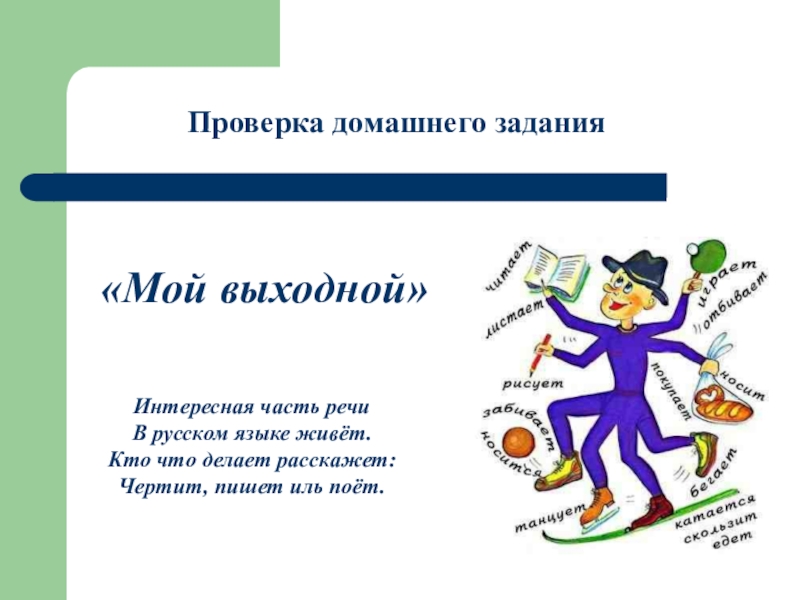 Проверка домашнего задания«Мой выходной»Интересная часть речиВ русском языке живёт.Кто что делает расскажет:Чертит, пишет иль поёт.