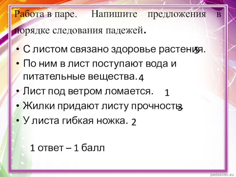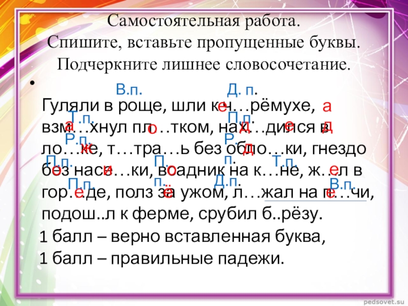 1 балл – верно вставленная буква, 1 балл – правильные падежи.