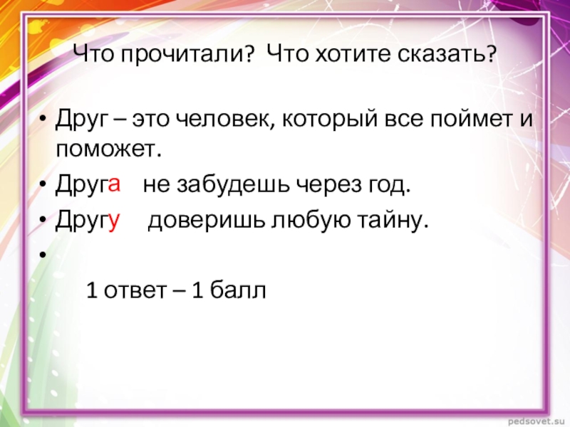 Это сайт презентаций, где можно хранить и обмениваться своими презентациями, докладами, проектами, шаблонами в формате PowerPoint с другими пользователями. Мы помогаем школьникам, студентам, учителям, преподавателям хранить и обмениваться учебными материалами.