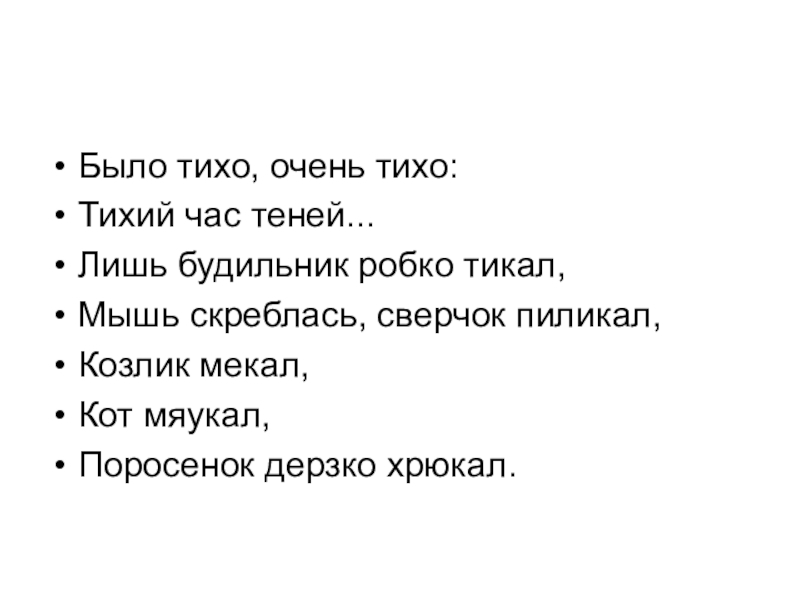 Было тихо, очень тихо:Тихий час теней... Лишь будильник робко тикал, Мышь скреблась, сверчок пиликал, Козлик мекал, Кот мяукал, Поросенок дерзко хрюкал.
