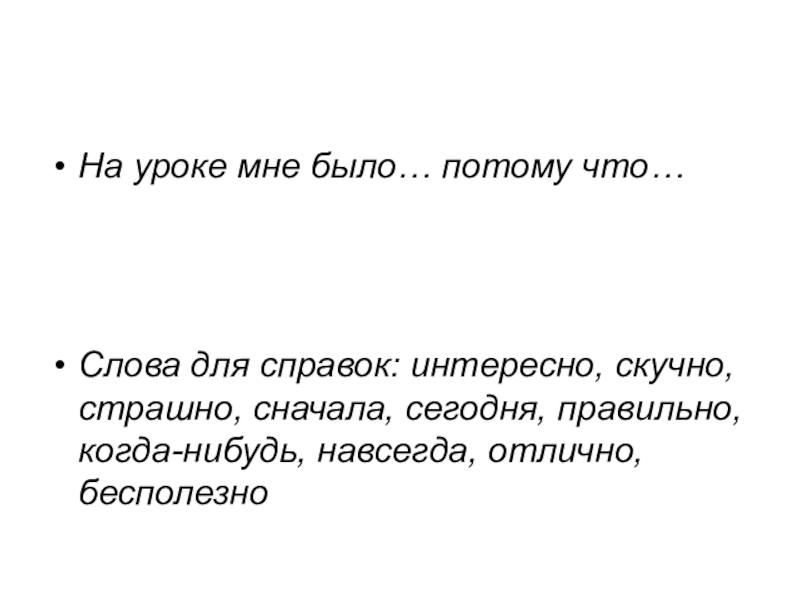 На уроке мне было… потому что…Слова для справок: интересно, скучно, страшно, сначала, сегодня, правильно, когда-нибудь, навсегда, отлично,