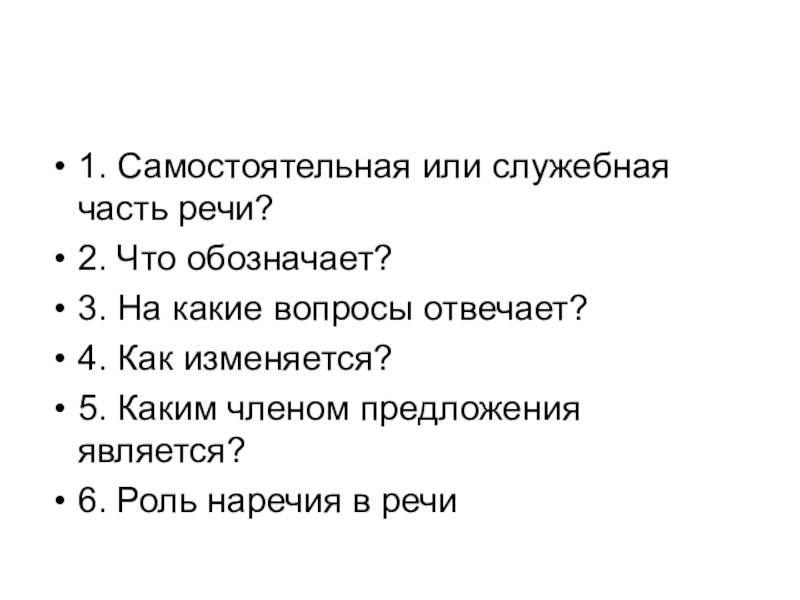 1. Самостоятельная или служебная часть речи?2. Что обозначает?3. На какие вопросы отвечает?4. Как изменяется?5. Каким членом предложения
