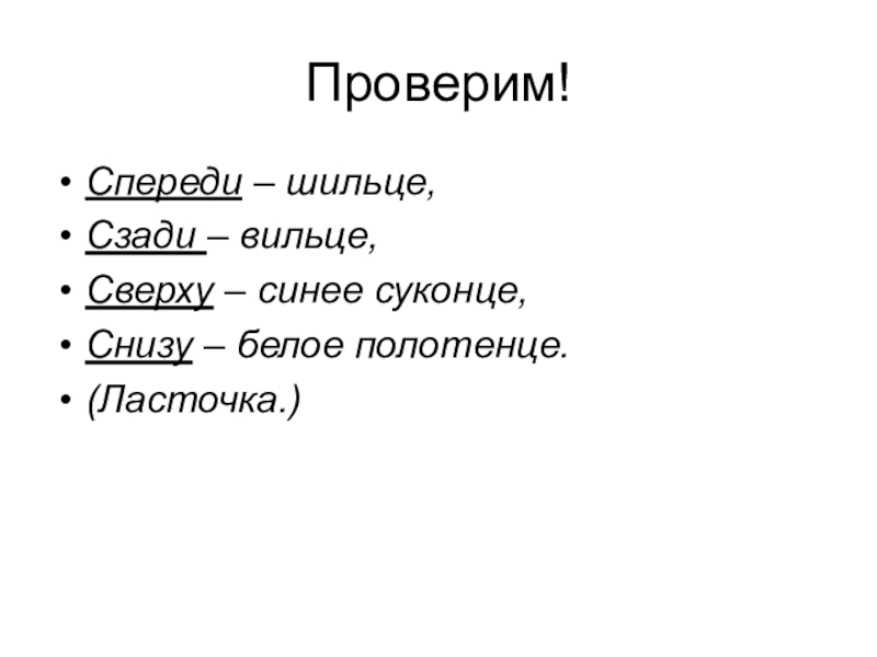 Проверим!Спереди – шильце,Сзади – вильце, Сверху – синее суконце,Снизу – белое полотенце. (Ласточка.)