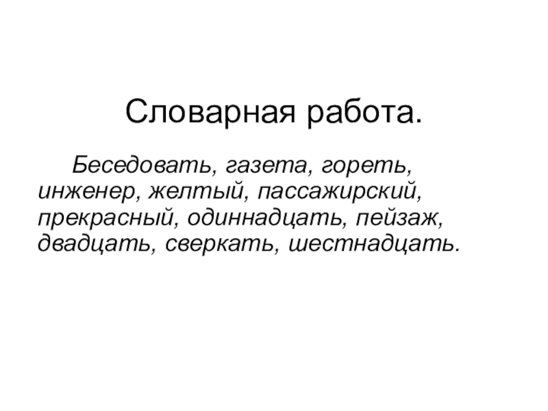 Словарная работа. Беседовать, газета, гореть, инженер, желтый, пассажирский, прекрасный, одиннадцать, пейзаж, двадцать, сверкать, шестнадцать.