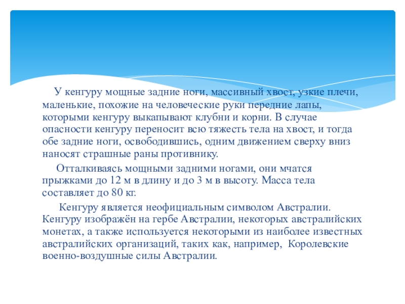 Слайд 28 У кенгуру мощные задние ноги, массивный хвост, узкие плечи,
