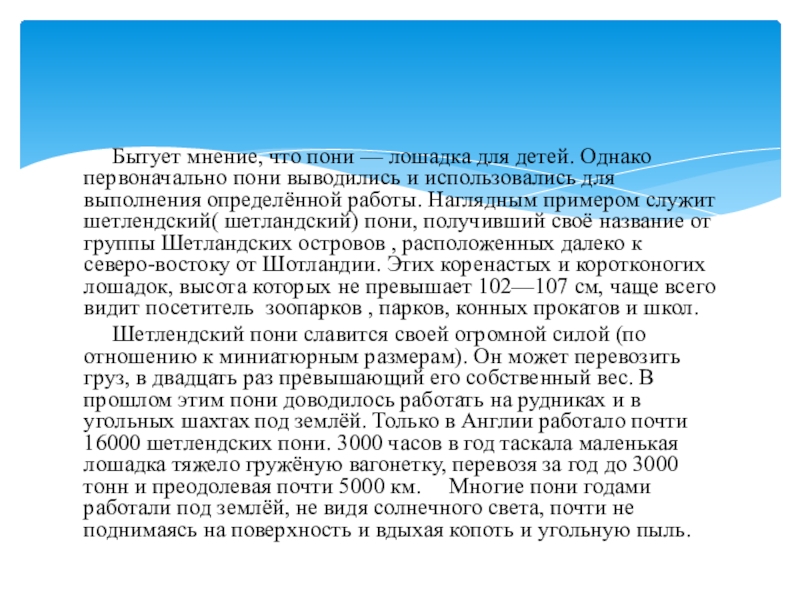 первоначально пони выводились и использовались для выполнения определённой работы. Наглядным примером служит шетлендский( шетландский) пони, получивший своё название от группы Шетландских островов , расположенных далеко к северо-востоку от Шотландии. Этих коренастых и коротконогих лошадок, высота которых не превышает 102—107 см, чаще всего видит посетитель зоопарков , парков, конных прокатов и школ.