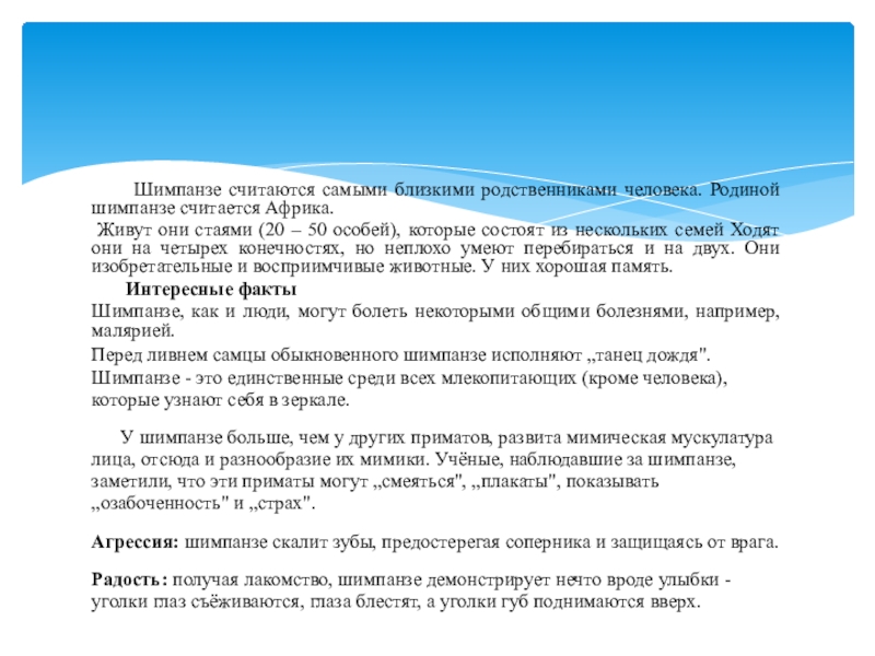 Слайд 19 Шимпанзе считаются самыми близкими родственниками человека. Родиной шимпанзе