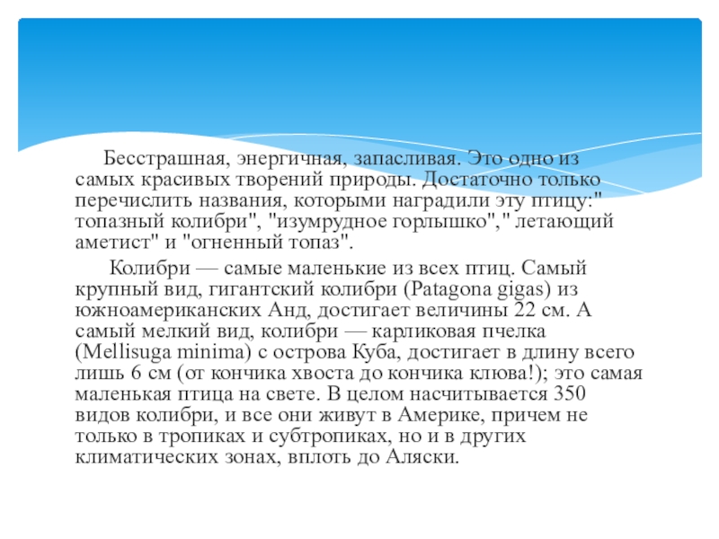 Колибри — самые маленькие из всех птиц. Самый крупный вид, гигантский колибри (Patagona gigas) из южноамериканских Анд, достигает величины 22 см. А самый мелкий вид, колибри — карликовая пчелка (Mellisuga minima) с острова Куба, достигает в длину всего лишь 6 см (от кончика хвоста до кончика клюва!); это самая маленькая птица на свете. В целом насчитывается 350 видов колибри, и все они живут в Америке, причем не только в тропиках и субтропиках, но и в других климатических зонах, вплоть до Аляски.