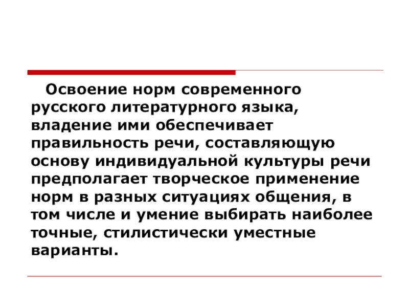 составляющую основу индивидуальной культуры речи предполагает творческое применение норм в разных ситуациях общения, в том числе и умение выбирать наиболее точные, стилистически уместные варианты.
